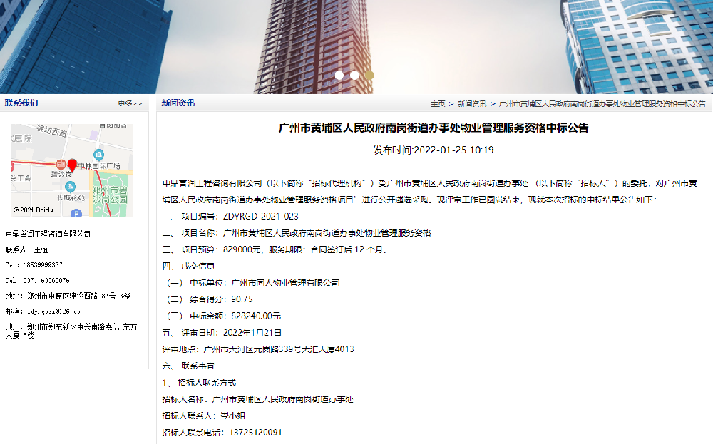 鼎點娛樂工程咨詢有限公司(以下簡稱“招標代理機構(gòu)”)受廣州市黃埔區(qū)人民政府南崗街道辦事處 (以下簡稱“招標人”)的委托,對廣州市黃埔區(qū)人民政府南崗街道辦事處物業(yè)管理服務(wù)資格項目”進行公開遴選采購。現(xiàn)評審工作已圓滿結(jié)束,現(xiàn)就本次招標的中標結(jié)果公告如下:一、項目編號:ZDYRGD-2021-023二、項目名[詳細]